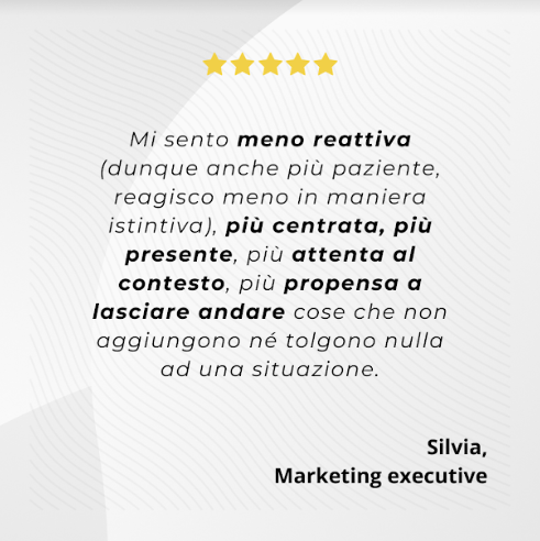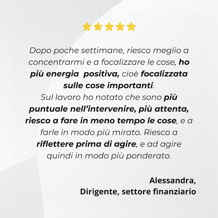 Alessia è esperta nell'applicazione delle tecniche di meditazione, yoga e Neuro-Training® al mondo del business. Negli ultimi 26 anni ha lavorato fianco a fianco con top executives di aziende internazionali, come consulente strategica prima e negli ultimi 12 anni allenandoli/le a sviluppare e consolidare le competenze interiori per realizzare i loro progetti e raggiungere i risultati desiderati.