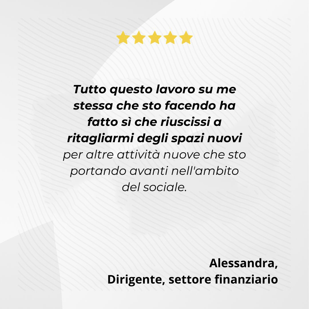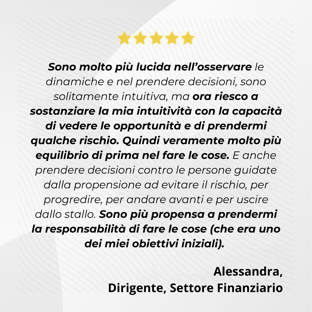 Alessia è esperta nell'applicazione delle tecniche di meditazione, yoga e Neuro-Training® al mondo del business. Negli ultimi 26 anni ha lavorato fianco a fianco con top executives di aziende internazionali, come consulente strategica prima e negli ultimi 12 anni allenandoli/le a sviluppare e consolidare le competenze interiori per realizzare i loro progetti e raggiungere i risultati desiderati.